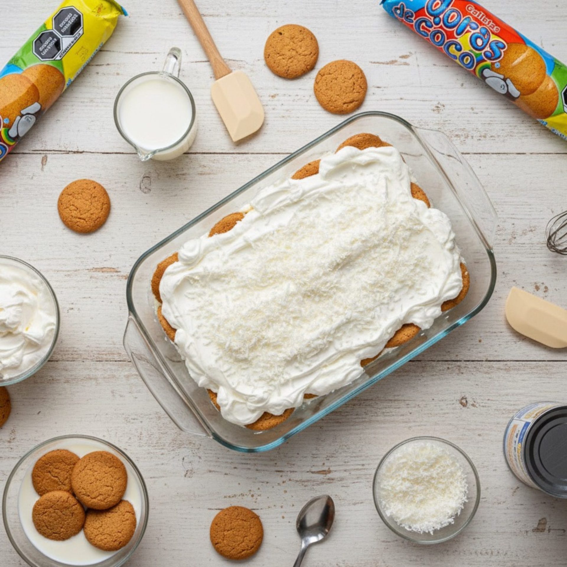 3. Agrega una capa de crema batida y espolvorea coco rallado.